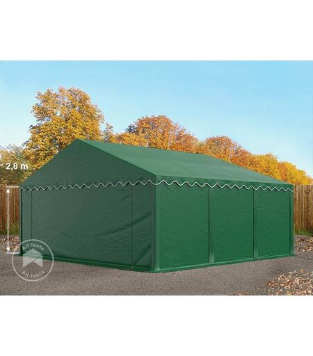 6x6 Storage Tent / Shelter w. ground frame, PVC 750, dark green: Struggling with limited storage space? The TOOLPORT [product_line] storage tent in dark green, with dimensions of 6x6m, offers a versatile and durable storage shelter to keep your materials safe and protected. The reinforced frame, made from fully galvanised steel tubes (inside and out), ensures maximum resistance to corrosion, rust, impacts, and scratches. Additional reinforcements in the roof area allow for efficient drainage of rain and snow, while the removable fixing base frame offers flexibility depending on your needs. The PVC 750 tarpaulin, featuring a dense inner mesh fabric, is exceptionally tear-resistant, hard-wearing, and long-lasting, with UV protection of 50+ in compliance with EN 13758-1. Two large zip-up doors provide easy access and excellent ventilation. Best of all, this storage tent requires no foundation, making it perfect for seasonal or temporary use. With a height of [product_height] and a weight of [product_weight], this multi-purpose storage shelter is quick and easy to assemble and dismantle, providing a practical solution for a wide range of storage needs. ...