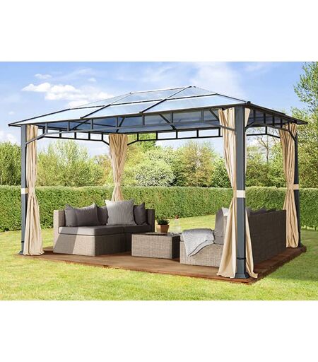 Garden Gazebo Hardtop Sunset Deluxe, 3x4m, champagne: Transform your garden or patio into a cosy retreat with the TOOLPORT garden gazebo. Part of the Sunset range, this modern and practical gazebo is available in champagne with dimensions of 3x4m. Perfect for year-round use, it is weatherproof, UV-resistant, and quick to assemble. The sturdy frame, made from durable Polycarbonatee sheets in a square profile, ensures excellent stability. Whether you’re looking for a gazebo with 4 side sections, a click system, or a double-rail system, our diverse selection allows you to choose the ideal option to suit your needs. Add both style and functionality to your outdoor space with this versatile garden gazebo, designed for comfort and lasting performance. ...