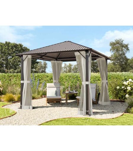 3x3m garden gazebo, Hardtop, 4 sides, cream: The Moonlight Deluxe garden gazebo combines elegance and functionality, making it an ideal addition to your outdoor space. Featuring a durable, waterproof hardtop roof made from UV-resistant polycarbonate panels and reinforced with aluminium struts, it offers reliable protection from the elements. The robust steel posts with an 80 mm square profile ensure stability and long-lasting performance. Available in two sizes—3x3 m or 3x3.65 m—and in sophisticated grey or cream, this gazebo is designed to suit a variety of garden styles. The structure includes 4 practical mosquito nets, 4 side panels with fastenings, 8 ground anchors, and all necessary assembly tools and instructions. With a passage height of 1.95 m and a ridge height of 2.6 m, the Moonlight Deluxe provides ample space for year-round use. ...