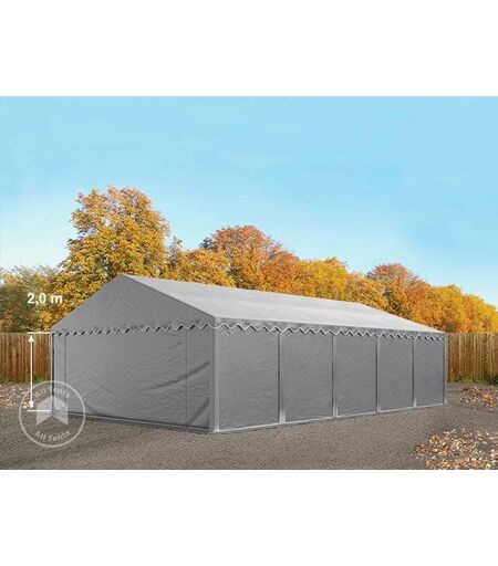 5x10m storage tent, PVC, grey: Need extra storage space? The TOOLPORT [product_line] storage tent in grey, with dimensions of 5x10m, provides a practical and spacious storage shelter in no time at all! Designed for quick assembly without the need for a foundation, this storage tent features two large zip-up doors for easy access. The robust PVC 700 roof tarpaulin is low-maintenance, highly durable, and easy to clean, offering UV protection of 50+ in accordance with EN 13758-1. With an eaves height of 2 metres, the fully galvanised steel frame is impact- and scratch-resistant, ensuring excellent protection against rust and corrosion. Ideal for temporary storage, this modern storage shelter provides a reliable solution for protecting equipment, materials, or vehicles from the elements. ...