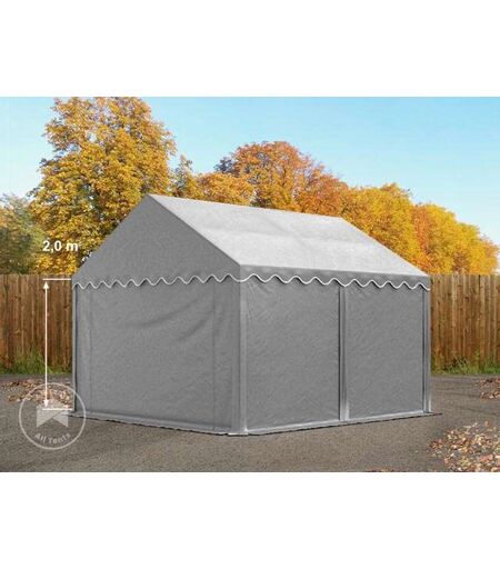 3x4m storage tent, PVC, grey: Need extra storage space? The TOOLPORT [product_line] storage tent in grey, with dimensions of 3x4m, provides a practical and spacious storage shelter in no time at all! Designed for quick assembly without the need for a foundation, this storage tent features two large zip-up doors for easy access. The robust PVC 700 roof tarpaulin is low-maintenance, highly durable, and easy to clean, offering UV protection of 50+ in accordance with EN 13758-1. With an eaves height of 2 metres, the fully galvanised steel frame is impact- and scratch-resistant, ensuring excellent protection against rust and corrosion. Ideal for temporary storage, this modern storage shelter provides a reliable solution for protecting equipment, materials, or vehicles from the elements. ...