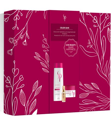 The perfect gift for your loved ones - or for yourself: Our Color Save Kit protects the hair color, ensures long-lasting color shine - and is the optimal choice for colored hair. Color Save Shampoo and Mask preserve the brilliance of the color, while LuxeOil Reconstructive Elixir restructures and protects. Wella SP Color Save Gift Box for colored hair contains: 1 x SP Color Save Shampoo 250 ml1 x SP Color Save Mask 200 ml 1 x SP Luxe Oil Reconstructive Elixir 30 ml (gold) COLOR SAVE SHAMPOO 250 ml The keratin shampoo preserves the luminosity of the hair color and gives long-lasting color shine. With beeswax, olive leaf extract and UV filter. Application: Massage evenly into damp hair and rinse thoroughly. COLOR SAVE MASK 200 ml The hair mask protects the hair color, even from harmful UV rays. With beeswax and olive leaf extract. Application: Massage evenly into washed hair, leave on for 5-10 minutes and rinse thoroughly. LUXEOIL RECONSTRUCTIVE ELIXIR 30 ml The hair oil protects the keratin and ensures immediate and long-lasting suppleness and shine. With argan, almond and jojoba oil. Also suitable for fine hair. Application: Distribute 1-2 pumps throughout the hair. Do not rinse out. By the way: Wella donates €1 per box to Make-A-Wish® - an initiative that makes wishes come true for seriously ill children. All information at www.makeawish.de ...