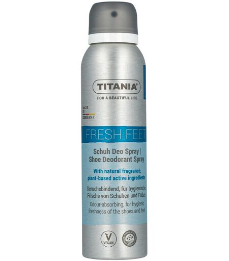 Odor-binding, for hygienic freshness of shoes and feet. TITANIA® Shoe Deodorant Spray has an odor-binding effect and ensures hygienic freshness. It inhibits the development of unpleasant odors on shoes and feet. Application: Spray on shoes shortly before wearing from a distance of approx. 20 cm, if necessary also after use. ...