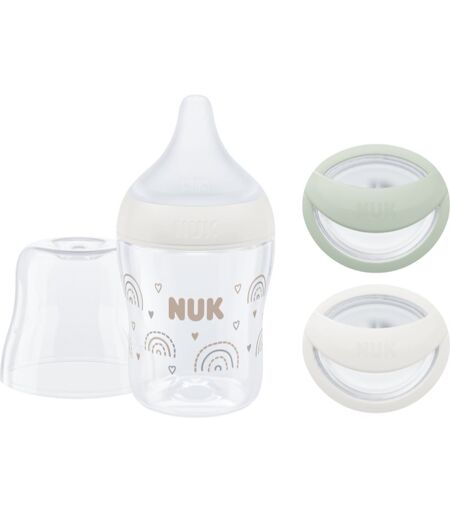NUK Newborn Gift Set, , Baby Bottles For Kids, When you’re unable to breastfeed your baby, you can always rely on the NUK Newborn Gift Set baby bottle. Its teat has a special shape to offer a feeling of comfort, which is so vital for a basic need such as feeding. Characteristics: suitable for babies including newborns amazing as a gift promotes the correct growth of teeth and gums adapts to the shape of your baby’s palate very good ventilation soft teat enables free breathing through the nose and swallowing of saliva doesn’t disrupt the sucking reflex effective airing system ventilated bottom – helps reduce the risk of a colic The set contains: NUK Perfect Match bottle with temperature control 150 ml NUK MommyFeel 0-9 m dummy 2 pc ...