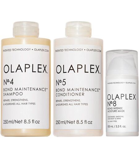 The OLAPLEX Intensive Care Set contains: 1 x OLAPLEX No. 4 Bond Maintenance Shampoo, 250 ml1 x OLAPLEX No. 5 Bond Maintenance Conditioner, 250 ml1 x OLAPLEX No. 8 Bond Intense Moisture Mask, 100 ml OLAPLEX No. 4 Bond Maintenance Shampoo: Visibly improves hair structure and gives hair incredible shine. OLAPLEX No. 5 Bond Maintenance Conditioner: Repairs and hydrates hair without weighing it down, improving structural damage and reducing split ends. For strong, healthy and shiny hair. OLAPLEX No. 8 Bond Intense Moisture Mask: Featuring patented OLAPLEX Bond Building Technology, this highly-concentrated, repairing 4-in-1 mask adds shine, intensely moisturizes and adds fullness. 2x more shine4x more moisture6x more suppleness94% see more fullness OLAPLEX Repairs damaged hair from the inside. Unlike other active ingredients, the original OLAPLEX ingredient does not work from the outside, but repairs hair from the inside out - by permanently bonding broken disulfide bridges in the hair. ...