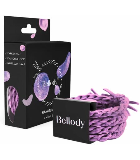 The carefully selected color variation makes Bellody hair ties a stylish accessory for any situation. Thanks to the braided structure, they adapt to individual hair types and provide maximum hold - without exerting pressure on the head. They add the right accent to any look, whether as hair ties or bracelets. This finally means hair ties without compromising on quality and design. 4 pieces per pack. SECURE HOLD: Whether you're playing sports or at work. Bellody hair elastics fit securely and provide strong hold without feeling pressured.STYLISH ARMBAND: When Bellody hair ties are not worn in the hair, they match almost any outfit as a stylish bracelet.NO TANGLING: Due to the braided structure, Bellody hair ties will not get tangled in your hair or pull out hair.MANY COLORS: Bellody's stylish braided hair ties can be obtained in modern trendy colors, as well as classic colors.GENTLE TO HAIR: Due to their ribbed structure, Bellody hair elastics are gentle on the hair and prevent kinks. Bellody is revolutionizing the world of hair accessories with uniquely innovative, high-quality and stylish products. This finally means an end to monotonous colors, inferior quality and plastic! Hair accessories, especially because they are worn visibly every day, are an important part of individual style and therefore an expression of personality. And that's exactly what every single Bellody product represents. ...