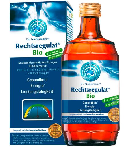 Liquid, fermented food enriched with vitamin C - the daily companion to support health¹, energy¹ and performance¹. Rechtsregulat® Bio is a liquid organic concentrate with fermented Regulatessenz® and natural vitamin C from the acerola cherry, which supports health, energy and performance. ¹Natural vitamin C from the acerola cherry contributes to normal energy metabolism, normal function of the immune and nervous systems and to the reduction of tiredness and fatigue. Vitamin C also contributes to the protection of cells from oxidative stress. Application: Take 10 ml of Rechtsregulat® Bio (equivalent to ½ measuring cup) undiluted in the morning and evening, hold in the mouth for a while before swallowing. In case of gastrointestinal sensitivity, drink Rechtsregulat® Bio diluted in a glass of water. Shake before use. Consume within one month after opening. Do not store above 25° C. The use of fresh ingredients may cause deviations in smell, color, taste and turbidity. Purely natural. ...