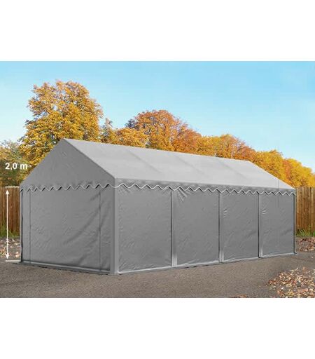4x8 Storage Tent / Shelter, PVC 700, grey: Need extra storage space? The TOOLPORT [product_line] storage tent in grey, with dimensions of 4x8m, provides a practical and spacious storage shelter in no time at all! Designed for quick assembly without the need for a foundation, this storage tent features two large zip-up doors for easy access. The robust PVC 700 roof tarpaulin is low-maintenance, highly durable, and easy to clean, offering UV protection of 50+ in accordance with EN 13758-1. With an eaves height of 2 metres, the fully galvanised steel frame is impact- and scratch-resistant, ensuring excellent protection against rust and corrosion. Ideal for temporary storage, this modern storage shelter provides a reliable solution for protecting equipment, materials, or vehicles from the elements. ...