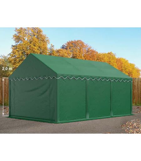 4x6 Storage Tent / Shelter w. ground frame, PVC 800, dark green: Looking for a dry, secure space for your vehicles, machinery, boats, or other materials, ideally all year round? Our TOOLPORT [product_line] storage tent in [colour], with dimensions of 4x6m, provides the perfect solution! The reinforced frame, constructed from fully galvanised steel poles (inside and out), ensures optimal protection against corrosion and rust, while being impact- and scratch-resistant. The robust design also features two zip gates, offering wide and accessible entrance points for easy access. The PVC tarpaulin, made from PVC, is tear-resistant, weatherproof, and durable, safeguarding your items against the elements. For added security, the storage shelter is available with an optional safety static set to meet your specific requirements. With a height of [product_height] and a weight of [product_weight], this multi-purpose storage tent is designed for quick and flexible assembly and dismantling. It’s also easy to extend and requires no foundation. ...