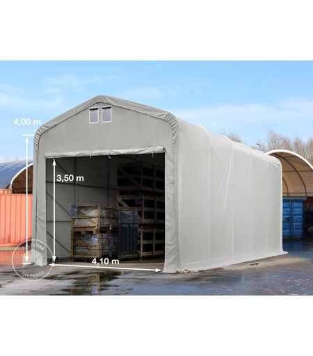 5x10m 4m Sides Commercial Storage Shelter, 4.1x3.5m Drive Through, PRIMEtex 2300, grey with statics package (soft ground anchors): Industrial and agricultural businesses rely on robust storage solutions to keep materials, machinery, and vehicles protected. The TOOLPORT [product_line] industrial tent in grey, with dimensions 5x10m, provides a durable and practical shelter for a wide range of applications. Designed for demanding environments, this industrial tent features an extra-strong oval tube profile made from fully galvanised steel, both inside and out. This ensures superior durability, effective load distribution, and maximum protection against rust and corrosion. The high-quality tarpaulin, made from PVC, is weatherproof all year round, low-maintenance, and easy to clean. Looking for a fire-safe certified tarpaulin? We’ve got you covered—fire-rated models are also available in our range. For added convenience, this industrial tent includes two large double zip doors on both gable ends and can be supplied with an optional static set for enhanced stability. ...