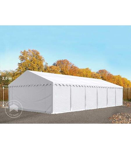 6x12 Storage Tent / Shelter, PVC 700, white: Need extra storage space? The TOOLPORT [product_line] storage tent in white, with dimensions of 6x12m, provides a practical and spacious storage shelter in no time at all! Designed for quick assembly without the need for a foundation, this storage tent features two large zip-up doors for easy access. The robust PVC 700 roof tarpaulin is low-maintenance, highly durable, and easy to clean, offering UV protection of 50+ in accordance with EN 13758-1. With an eaves height of 2 metres, the fully galvanised steel frame is impact- and scratch-resistant, ensuring excellent protection against rust and corrosion. Ideal for temporary storage, this modern storage shelter provides a reliable solution for protecting equipment, materials, or vehicles from the elements. ...