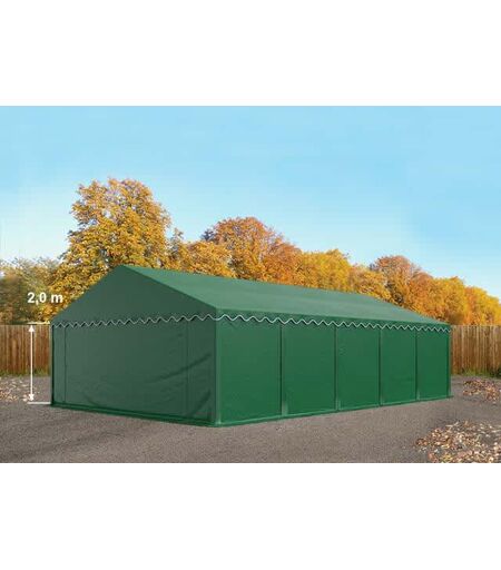 5x10 Storage Tent / Shelter, PVC 700, dark green: Need extra storage space? The TOOLPORT [product_line] storage tent in dark green, with dimensions of 5x10m, provides a practical and spacious storage shelter in no time at all! Designed for quick assembly without the need for a foundation, this storage tent features two large zip-up doors for easy access. The robust PVC 700 roof tarpaulin is low-maintenance, highly durable, and easy to clean, offering UV protection of 50+ in accordance with EN 13758-1. With an eaves height of 2 metres, the fully galvanised steel frame is impact- and scratch-resistant, ensuring excellent protection against rust and corrosion. Ideal for temporary storage, this modern storage shelter provides a reliable solution for protecting equipment, materials, or vehicles from the elements. ...