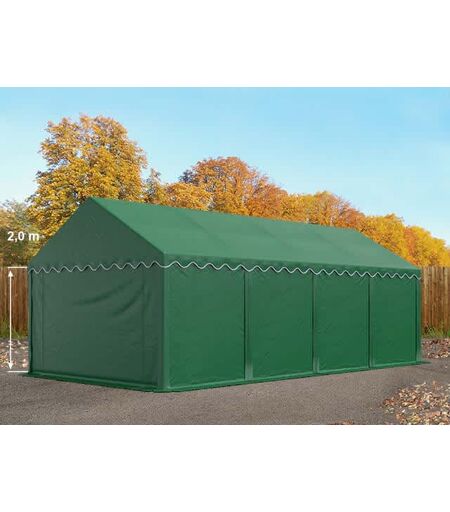 4x8 Storage Tent / Shelter w. ground frame, PVC 750, dark green: Struggling with limited storage space? The TOOLPORT [product_line] storage tent in dark green, with dimensions of 4x8m, offers a versatile and durable storage shelter to keep your materials safe and protected. The reinforced frame, made from fully galvanised steel tubes (inside and out), ensures maximum resistance to corrosion, rust, impacts, and scratches. Additional reinforcements in the roof area allow for efficient drainage of rain and snow, while the removable fixing base frame offers flexibility depending on your needs. The PVC 750 tarpaulin, featuring a dense inner mesh fabric, is exceptionally tear-resistant, hard-wearing, and long-lasting, with UV protection of 50+ in compliance with EN 13758-1. Two large zip-up doors provide easy access and excellent ventilation. Best of all, this storage tent requires no foundation, making it perfect for seasonal or temporary use. With a height of [product_height] and a weight of [product_weight], this multi-purpose storage shelter is quick and easy to assemble and dismantle, providing a practical solution for a wide range of storage needs. ...