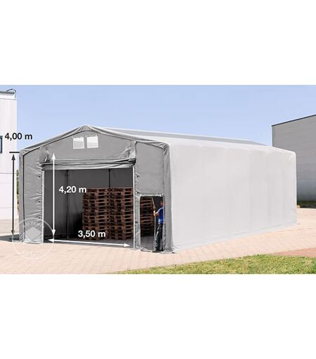 8x16m - 4.0m Sides Industrial Tent with pull-up gate and skylights, PRIMEtex 2300, grey with statics package (concrete anchors): Whether it's summer or winter, your vehicles, machinery, or goods will stay dry and secure in the TOOLPORT [product_line] industrial tent in grey, with dimensions 8x16m. Designed for stability and versatility, this durable outdoor storage solution stands at a height of [product_height] and weighs [product_weight], making it ideal for a range of applications. The high-quality tarpaulin, made from PVC, features a dense grid inner mesh, ensuring durability, tear resistance, and easy maintenance—even in harsh weather conditions. The fully galvanised steel frame, both inside and out, offers excellent impact and scratch resistance for long-term reliability. For added flexibility, a structural analysis kit is available as an optional extra. Our industrial tents require no permanent foundation, and depending on the model, they come equipped with either two large double zip doors for generous access or a wind-resistant, lockable sliding door for enhanced security. ...